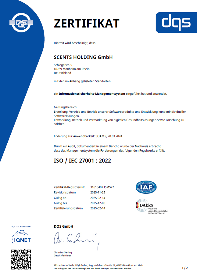 Die SCENTS HOLDING hat zusammen mit ihren Tochtergesellschaften SCENTS SOFTWARE GmbH und SCENTS HEALTH GmbH im Dezember 2022 die internationale ISO 27001-Akkreditierung erhalten.